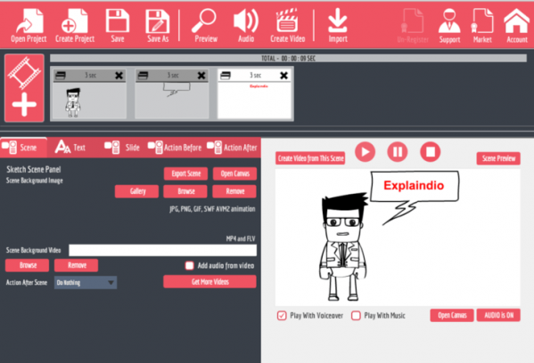 यदि आप मॉडर्न और फीचर रिच Whiteboard Animation सॉफ़्टवेयर की तलाश में हैं, तो आप Explaindio को एक ज़रूर Try करना चाहए। यह Whiteboard Animation टूल आपको जीआईएफ एनिमेशन और वीडियो पर Whiteboard Animation इफ़ेक्ट बनाने की परमिशन देता है। इंटरफ़ेस फीचर से भरा हुआ है और आपके वीडियो को कस्टमाइज़ करने के लिए बड़े आप्शन प्रोवाइड करता है। यह आपको अच्छे क्वालिटी वाली बैकग्राउंड इमेज का यूज़ करके एचडी वीडियो बनाने की परमिशन देता है। आप दुसरे वीडियो एडिटिंग सॉफ्टवेयर से वीडियो स्लाइड या ऑडियो फ़ाइलों को भी इम्पोर्ट कर सकते हैं।